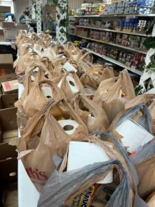 These are the bags of groceries waiting to go out today, prepped with loving hands and hearts by our incredible volunteers.  We fed 363 people today. But we also gave out more hugs than I can count.  We took turns holding one another’s burdens, if even for a moment.  We helped a neighbor make a plan to find housing, helped another neighbor get a phone, provided follow through to acquire mental health care for another struggling neighbor, helped another neighbor get their laundry clean for an important appointment, and at the end of it all shared our extra produce with the mission. While it feels like the world is broken, like the disconnect and divisiveness could just about make you lose hope, at Helping Hands we keep putting our heads down and looking for more ways to love one another. We can all do this.